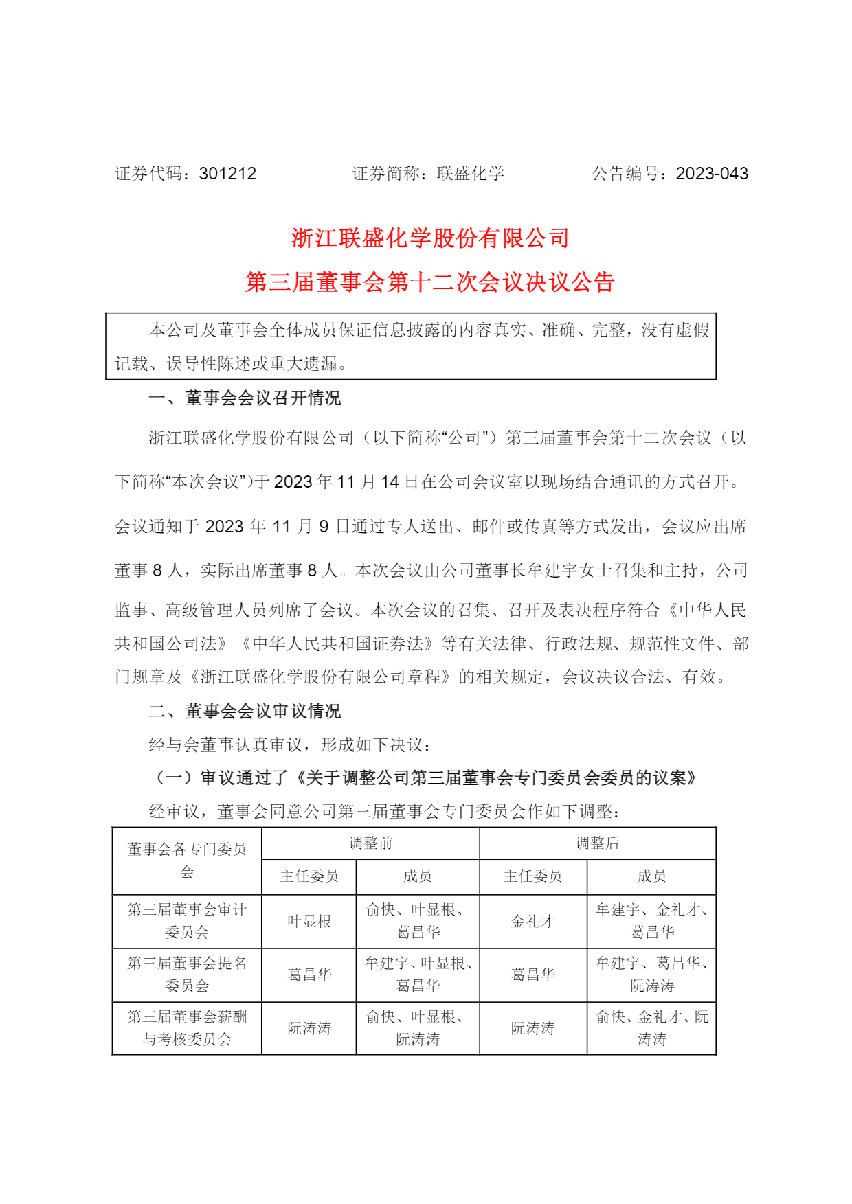 浙江聯(lián)盛化學(xué)股份有限公司第三屆董事會第十二次會議決議公告